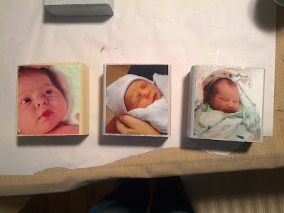 Next, get a printed copy of a picture- it could be baby, graduation, wedding, birthday, etc. In this case, I have three adorable baby pictures. Cut each picture slightly smaller than the size of the block so that you can see just a little bit of the paint around the edges of the picture.